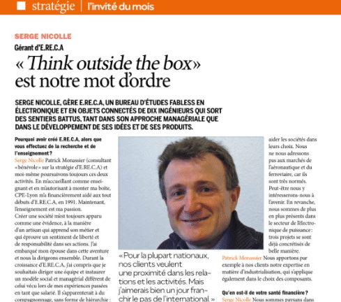 Cela fait du bien à notre égo ! Dans son numéro 132 ElectroniqueS, découvrez l’interview réalisée par Arnaud PAVLIK dans le rubrique « l’invité du mois ». Vous y découvrirez ERECA ingénierie Electronique, Informatique et Mécatronique à travers ses valeurs RSE, ses métiers dans l’ingénierie, l’électronique, l’embeddedsystems et les profils que nous recherchons, notre stratégie de développement. On y parle artisans, CPE Lyon, CARA Transport & Mobility Systems informatique, Minalogic,
