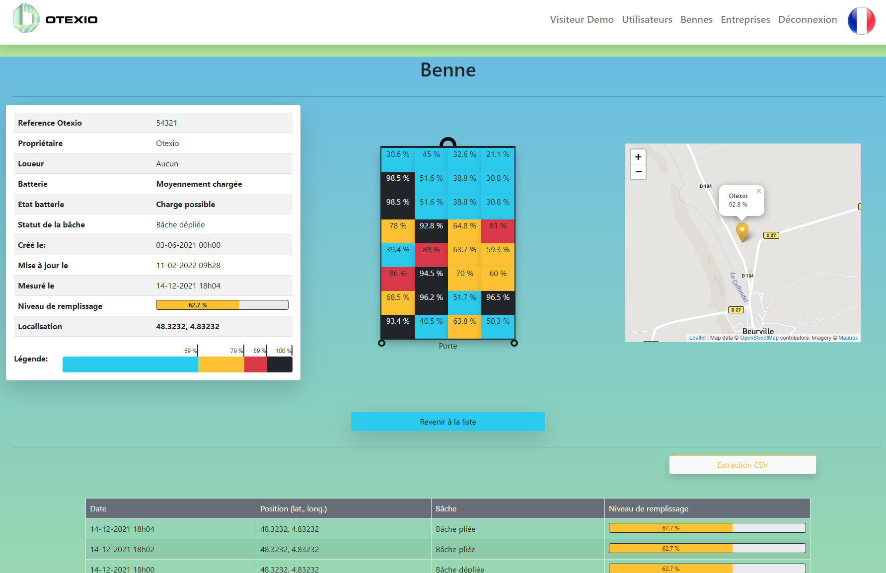 Projet : Application Web dédiée au suivi des bennes de déchets pour visualiser en temps réel le taux de remplissage des bennes ainisi que leur géo-localisation. Le serveur communique avec l'objet embarqué sur la benne via une liaison 4G.